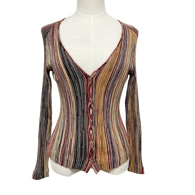 中古 ミッソーニ MISSONI 長袖 カーディガン クリーニング済み マルチカラー ストライプ柄 レディース Mサイズ 相当