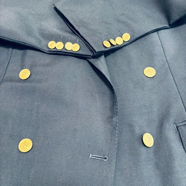 さらっとしたネイビーのウール地に刻印の金ボタンが映える色合わせ。