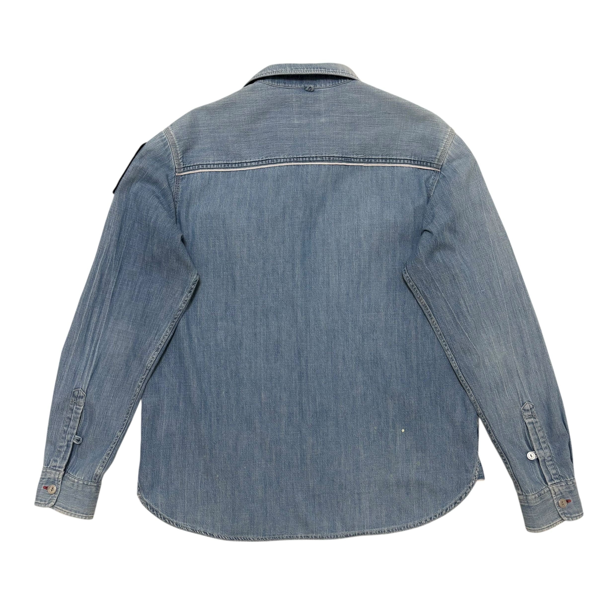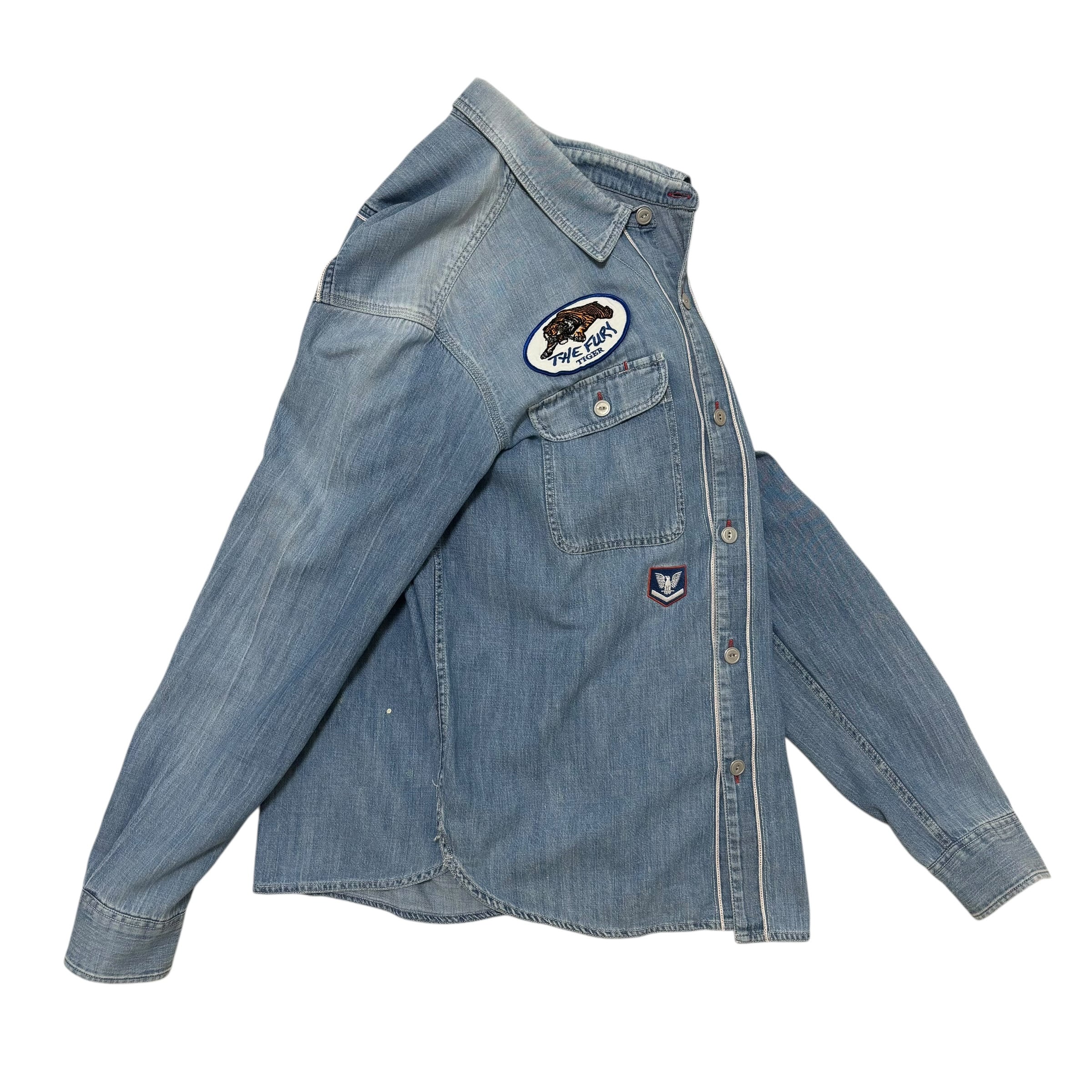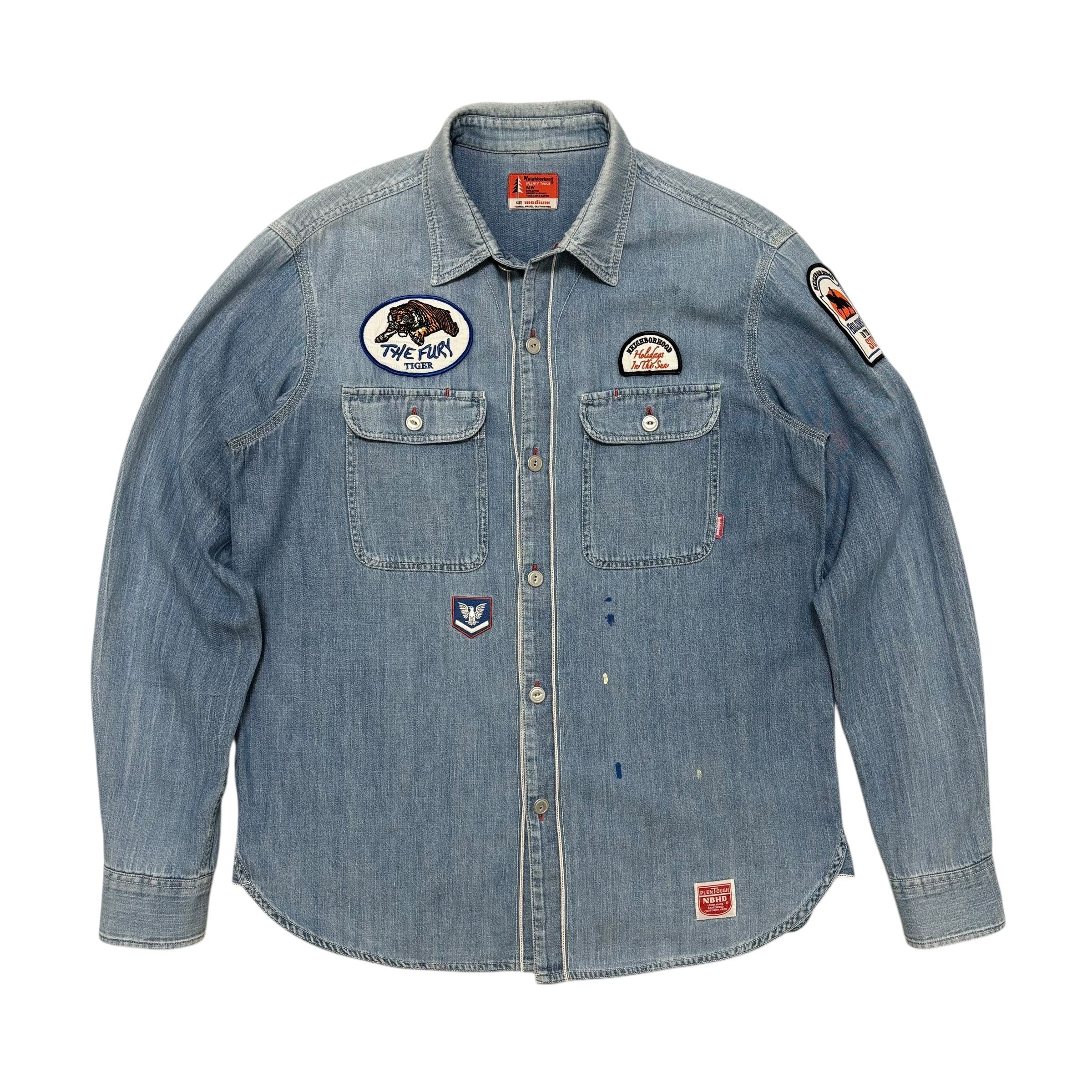 NEIGHBORHOODのデニムシャツ。ユーズド加工によるやわらかな色落ちや、手しごとの跡を感じるパッチやペイントが、個性を添えています。
