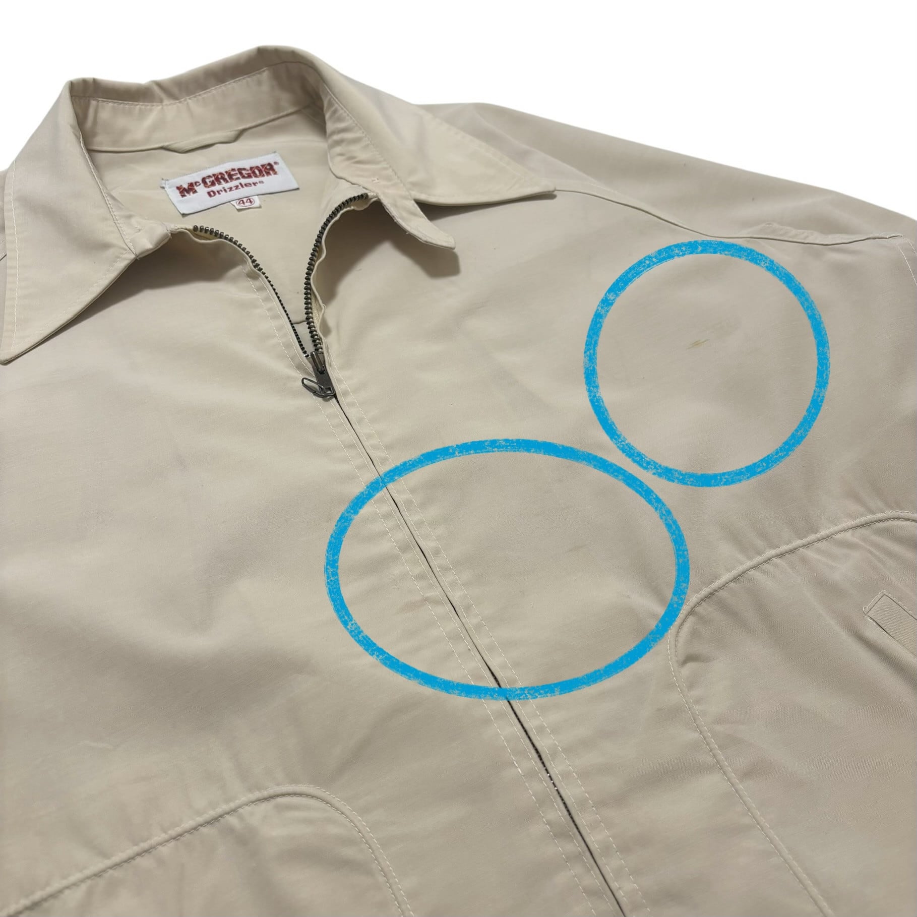 スポーツブルゾンの名品、70年代頃のMcGREGOR ドリズラージャケット(Lサイズ相当)。シェルは非常に綺麗な発色のベージュ。