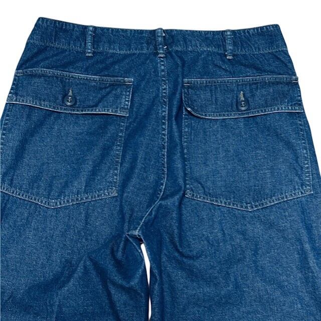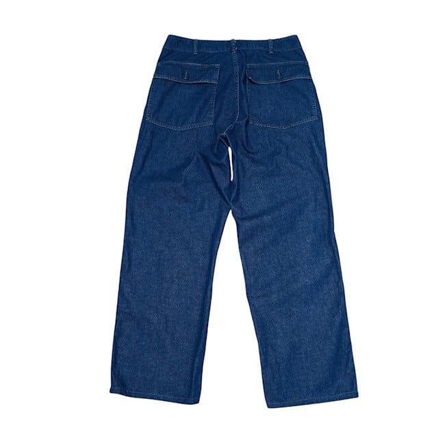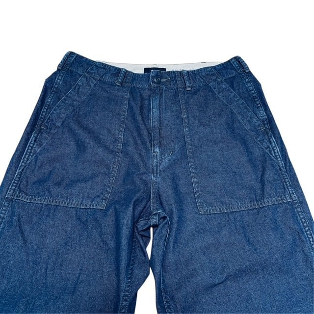 前後の大きなポケットが特徴的な、デニム素材のベイカーパンツです。