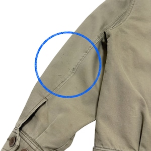 備考:シミ抜きを行ないきれいになりました。(画像7枚目)、落ちきれなかったシミあり(画像8枚目)、袖ボタン1つ欠損と両袖先に糸ほつれあり(画像5枚目)