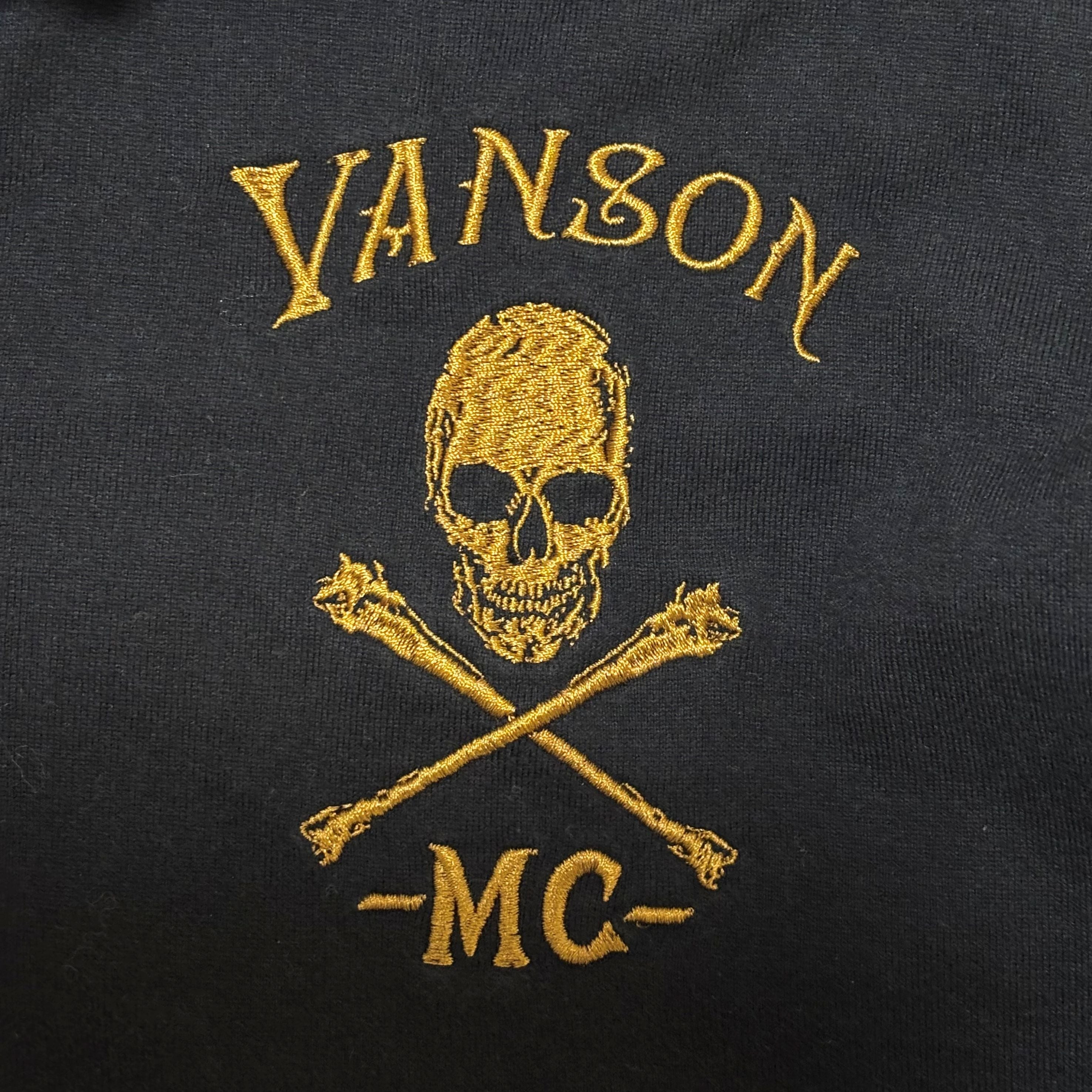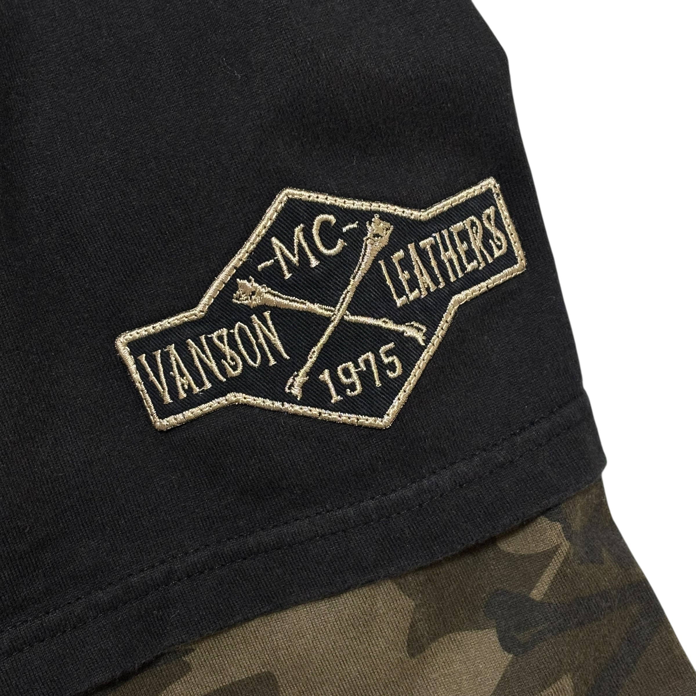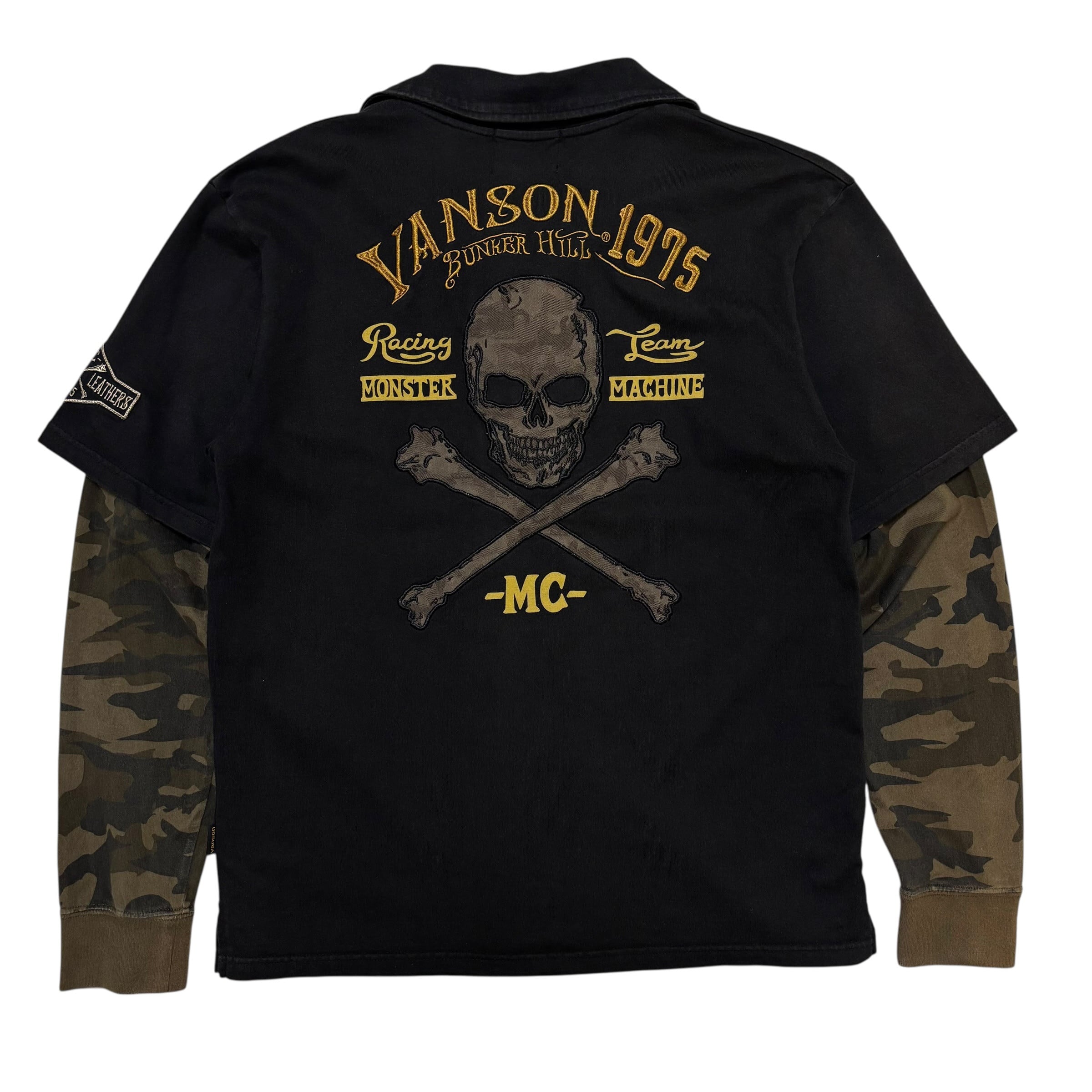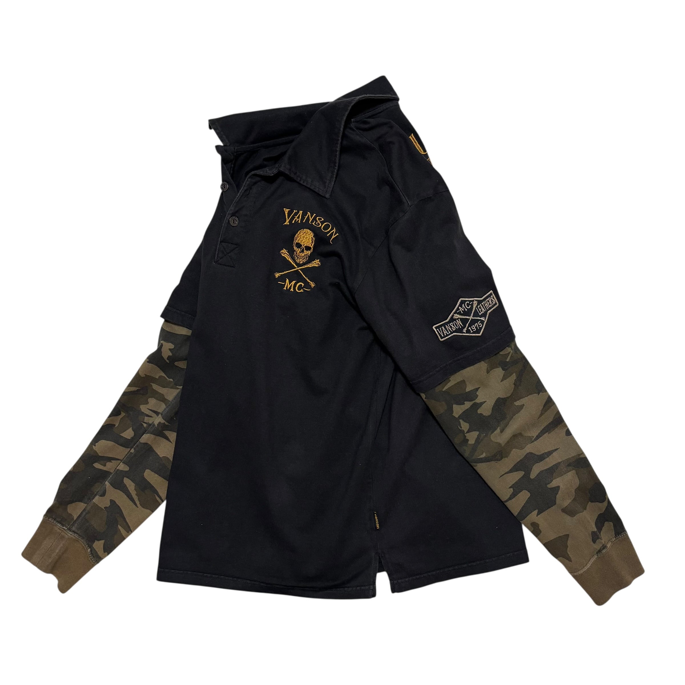 古着 バンソン VANSON 長袖 ポロシャツ フェイクレイヤード クロスボーン スカル 刺繍 迷彩 クリーニング済み メンズL