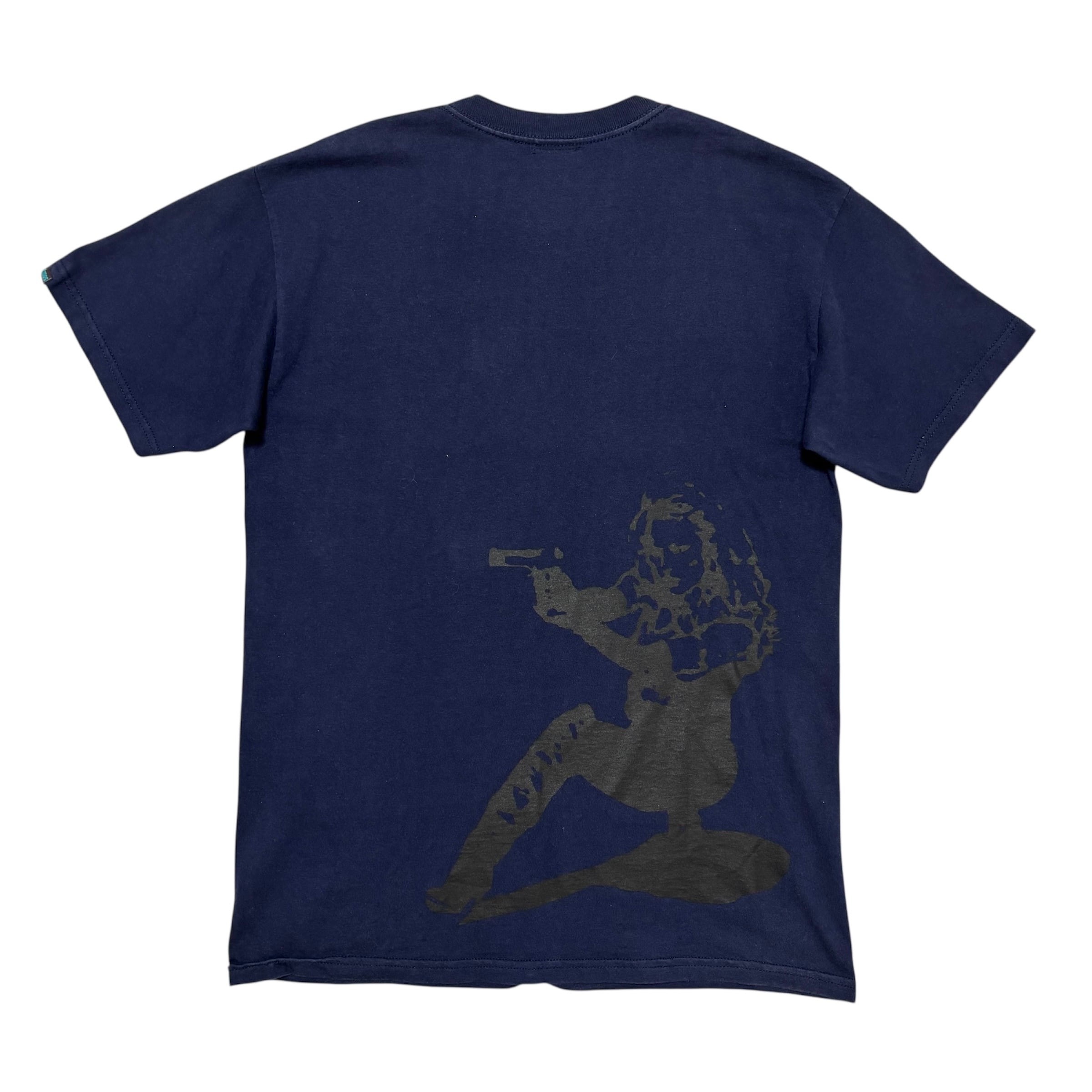 少し色あせたネイビーをベース色に、女性が銃を構えるシルエットをプリントデザインした洒落た1着。ストリート着としておススメです。