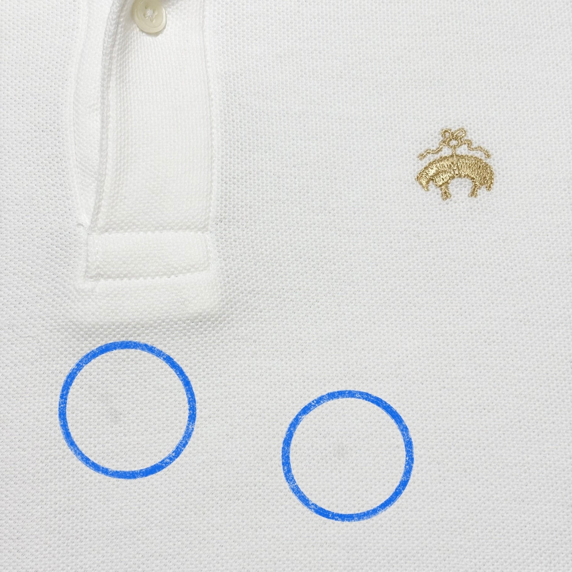 無地のホワイト色に、胸元にゴールデンフリースGOLDEN FLEECEのワンポイント刺繍が入る1着。