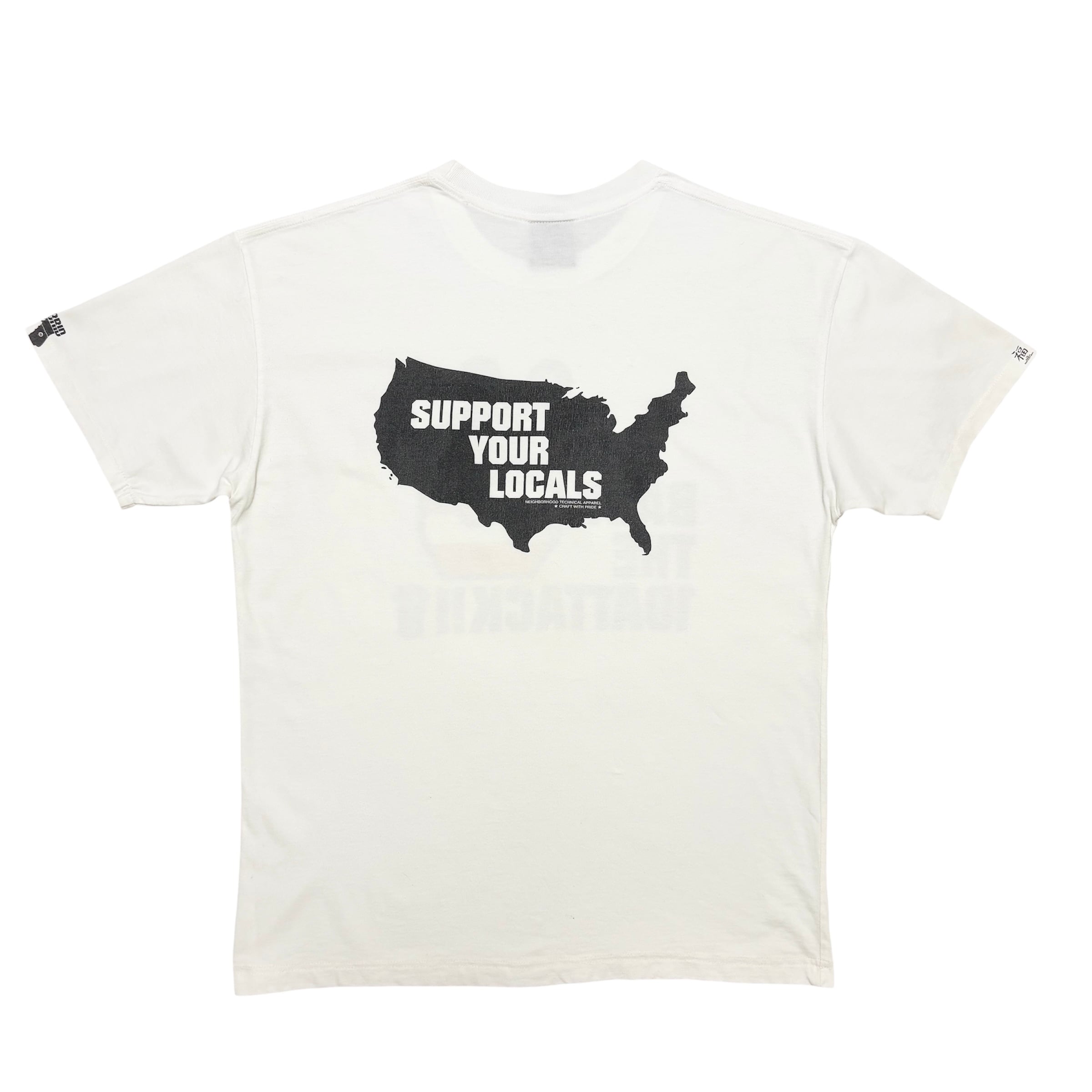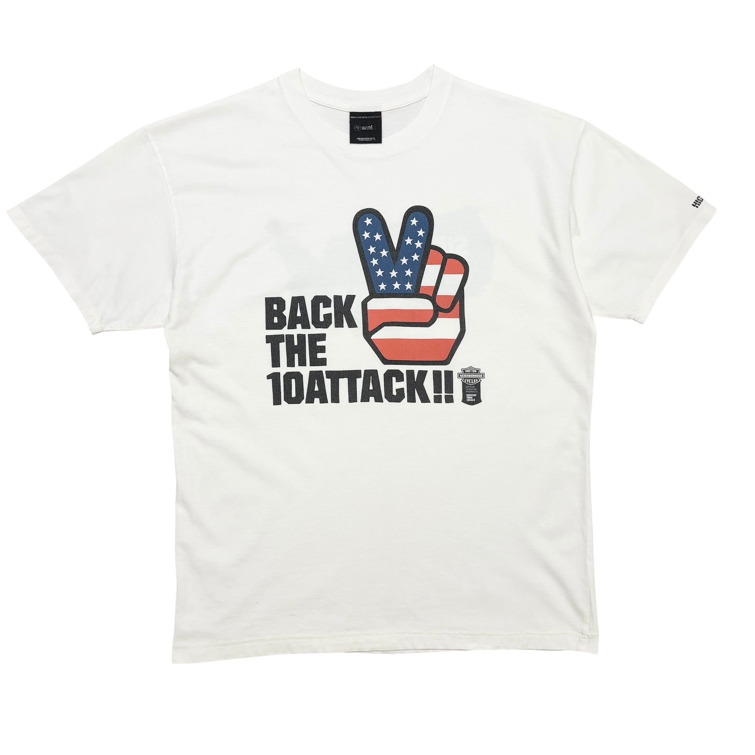 2000年初期頃のNEIGHBORHOOD(ネイバーフッド)「BACK THE 10ATTACK!!」Tシャツ。星条旗デザインのハンドサインが印象的なストリート/バイカーグラフィック。