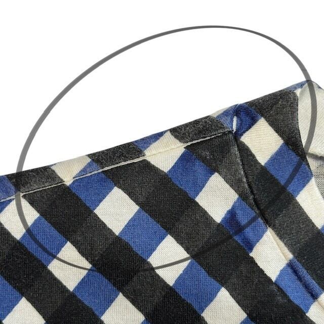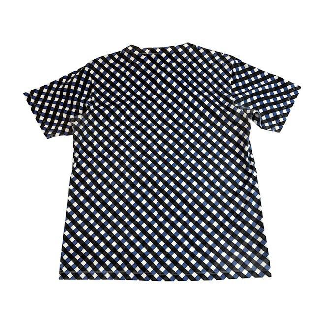 白のコットン地に、ブラックとブルーのギンガムチェックが斜めに配された総柄デザイン。