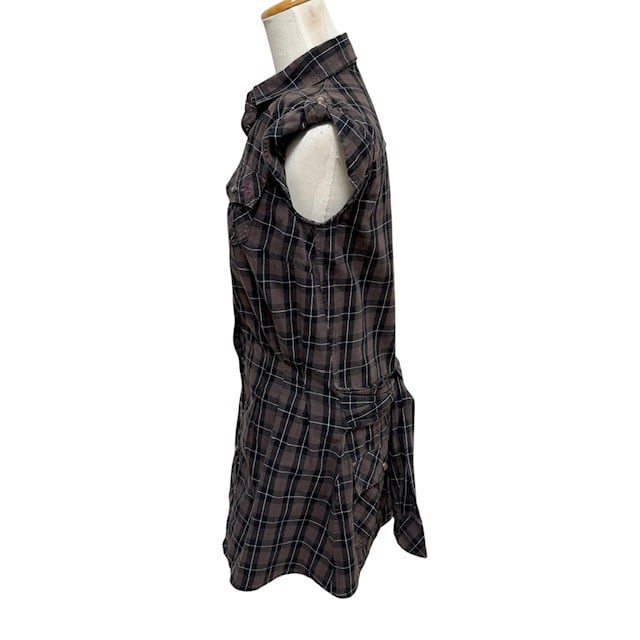 ブラウンをベースにしたチェック柄の半袖シャツワンピース。