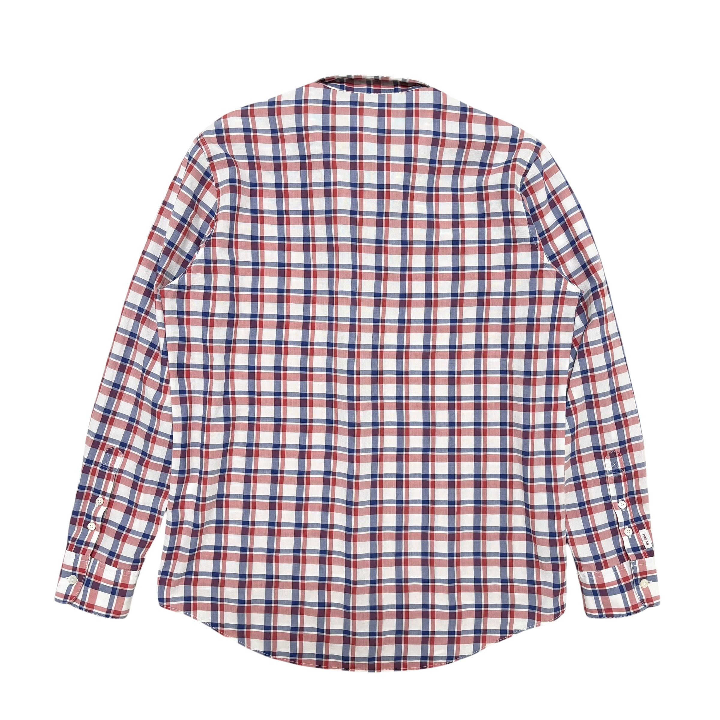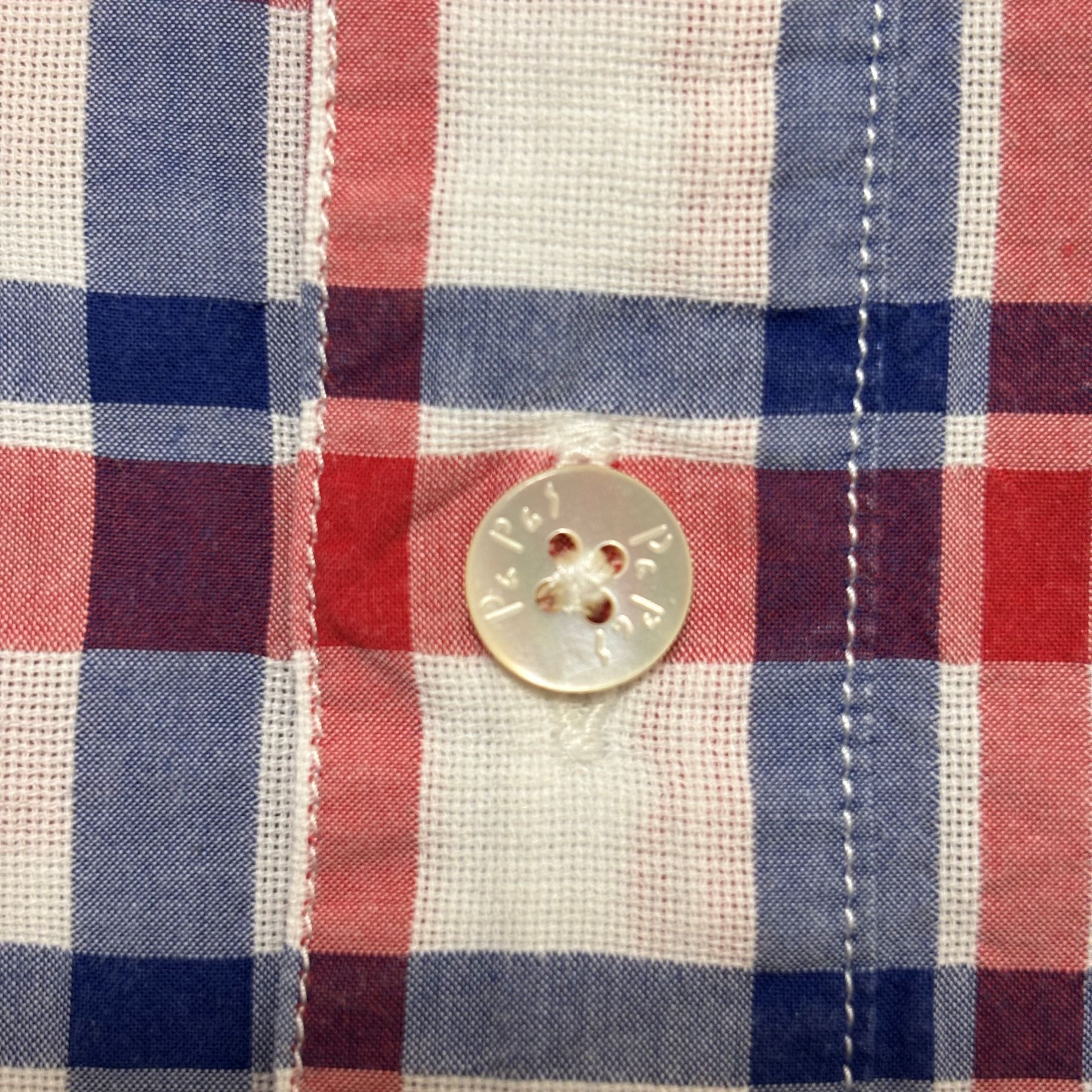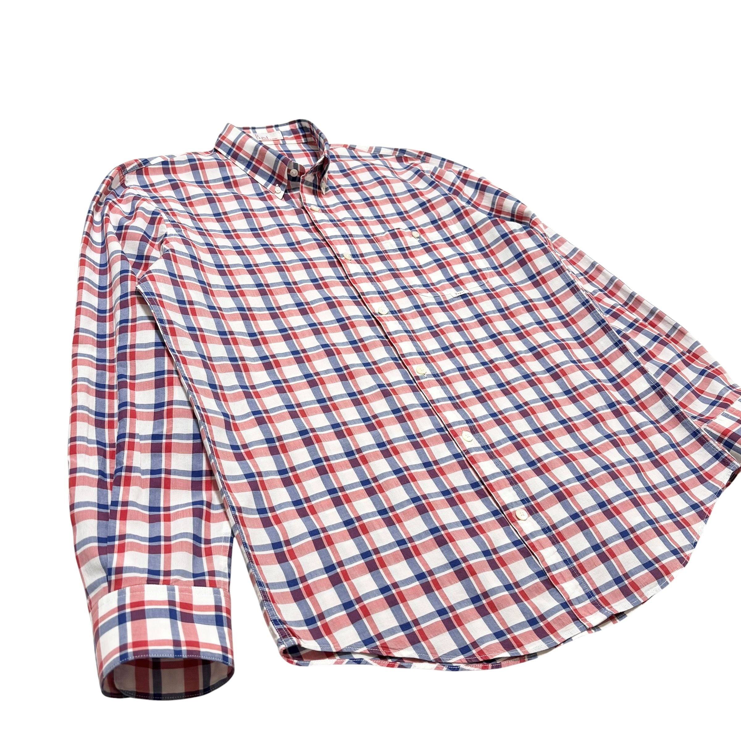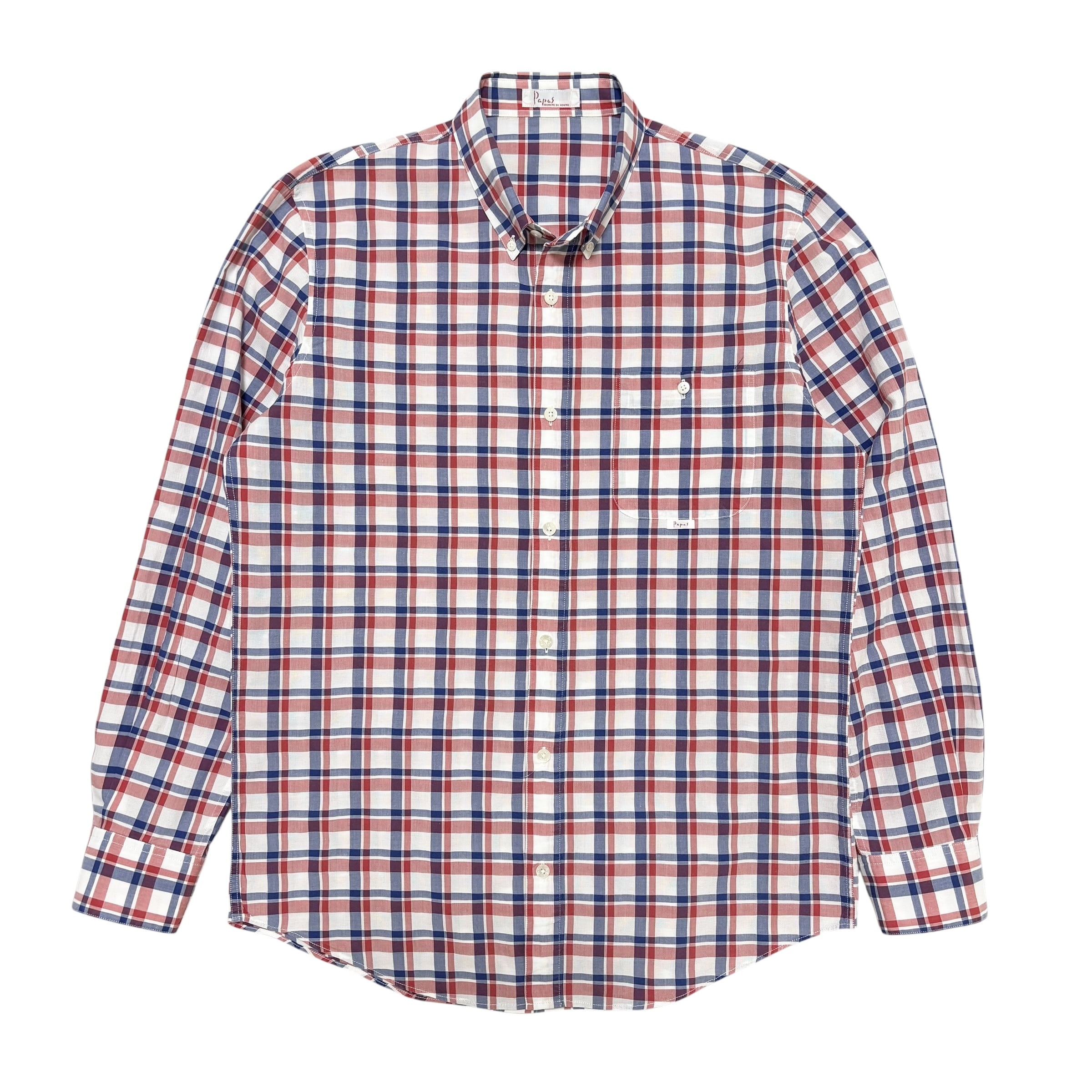 綿100%のボタンダウンシャツで、赤・紺・白のチェックが落ち着いた雰囲気を添えます。