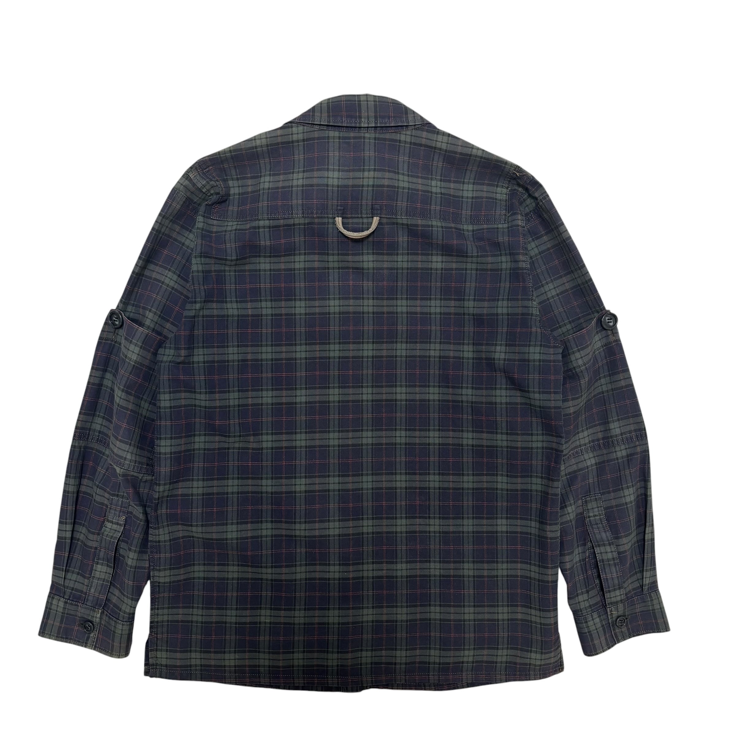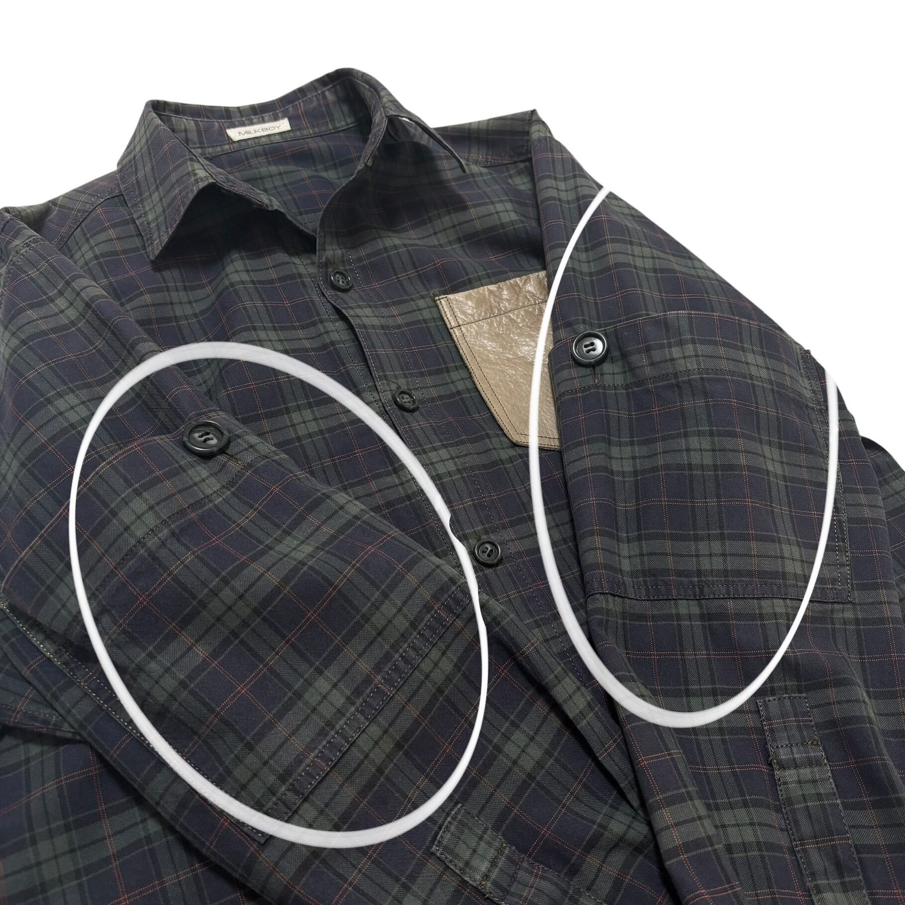 落ち着いたチェック柄に、胸元のレザーポケットが控えめな表情を添える一着です。