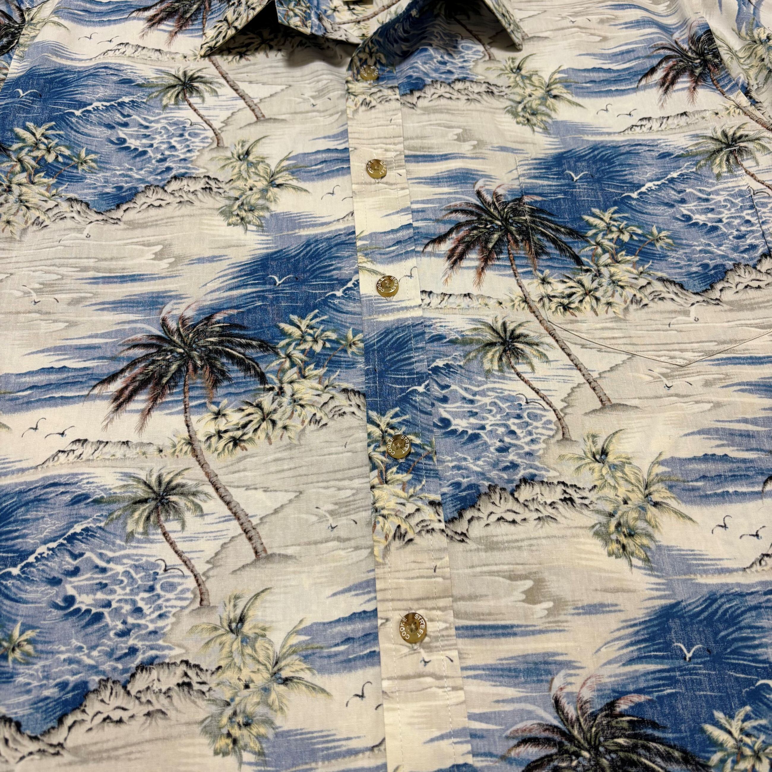 Cooke Street のアロハシャツ。海辺の風景が静かに広がる一枚で、コットン素材の軽い着心地が特徴です。