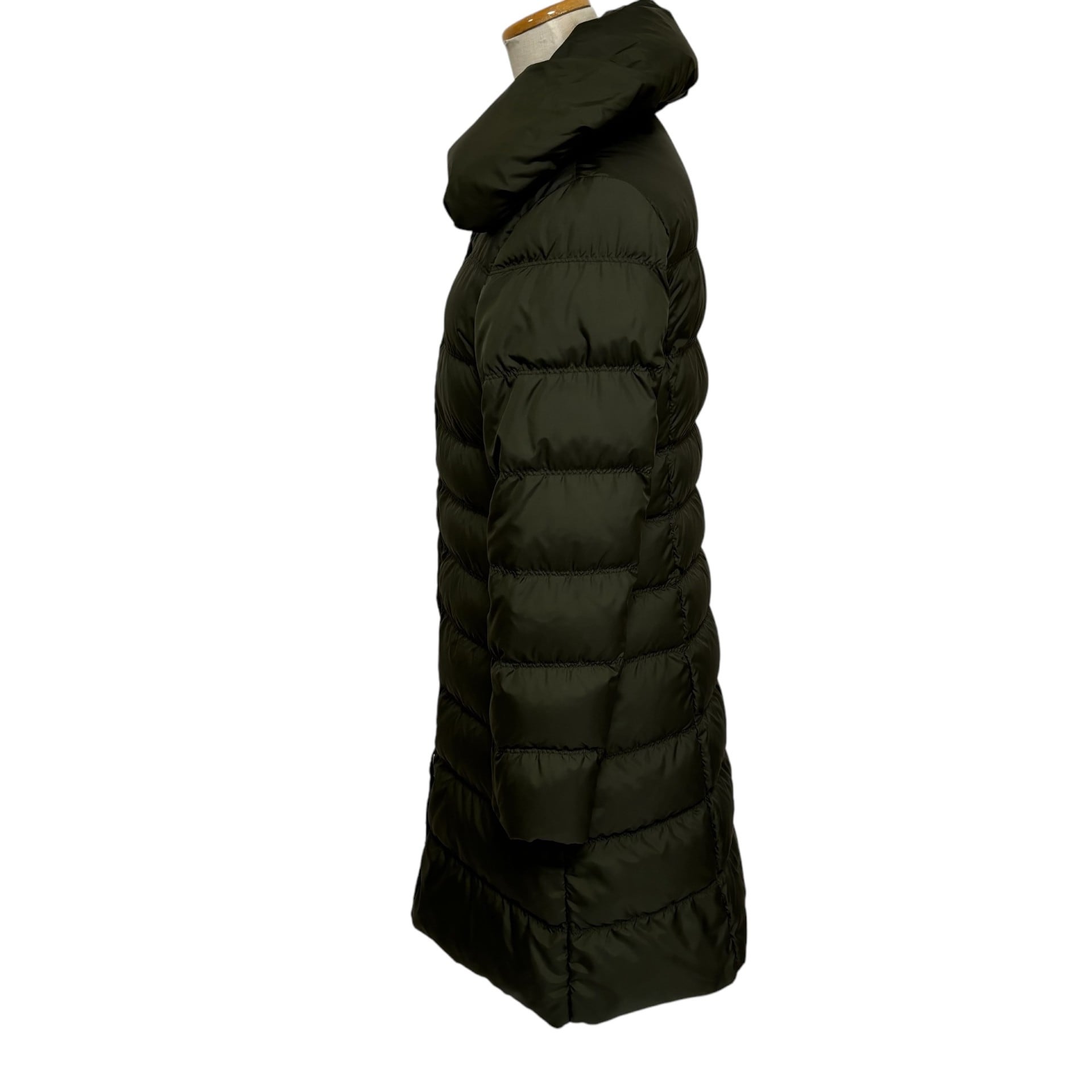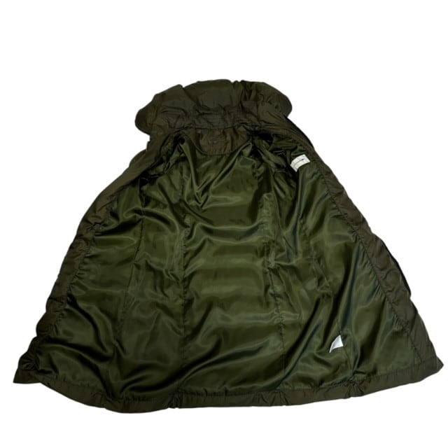 深みのあるモスグリーンカラーの膝丈ダウンコートになります。
