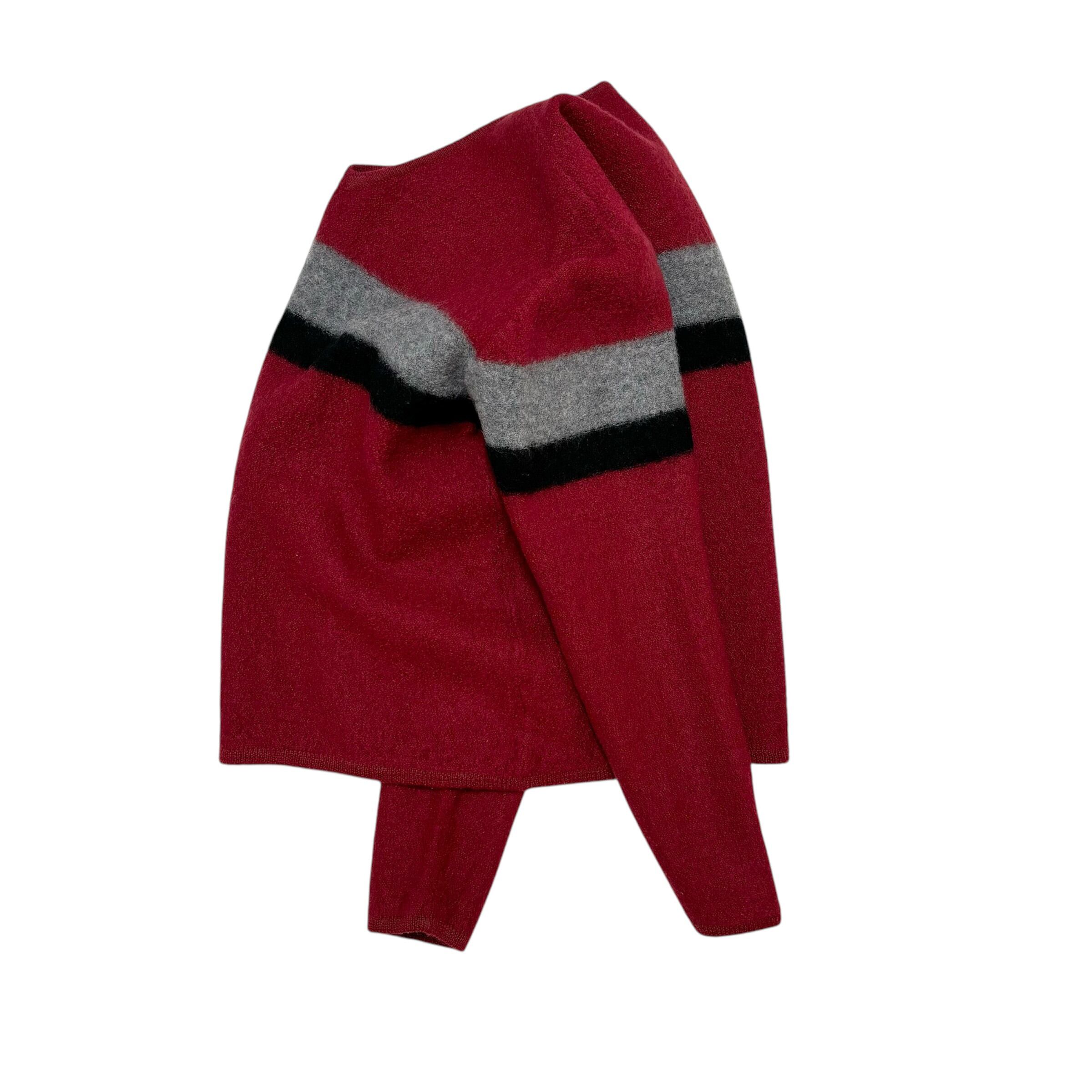 深みのあるレッドの落ち着いた色合いに、ブラックとグレーのボーダー柄の入るブイネックタイプの1着。何にでも合わせやすく幅広いコーディネートが楽しめます。